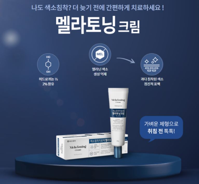 - 피부의 색소침착을 일으키는 멜라닌 세포의 생성을 억제하는 히드로퀴논(Hydroquinone)이 주성분이며, 피부에 침착된 멜라닌 색소를 분해하고, 재거해서 피부를 깨끗하게 만들어 줍니다.