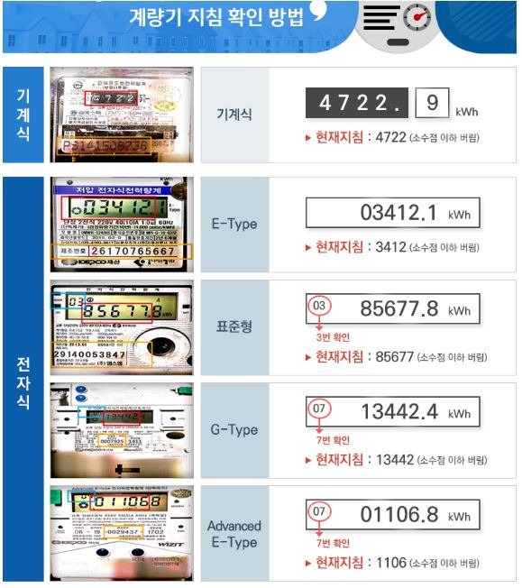 - 계량기를 보는 방법으로 기계식과 전자식에 따라 차이가 있으며, 기계식은 현재의 지침만 보입니다.