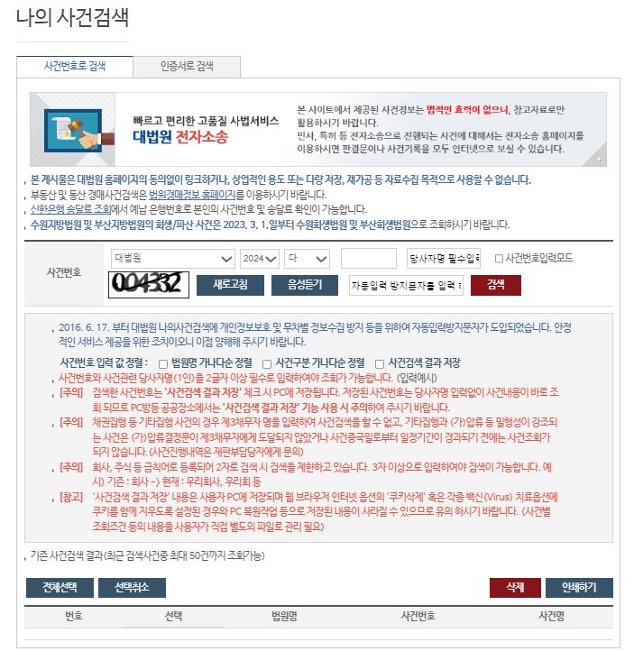 • 검색한 사건번호를 사건검색 결과 저장을 체크하면 PC에 내용이 저장되기 때문에 공공장소나 많은 사람들이 사용하는 PC는 반드시 체크를 해제하고 조회해야 합니다.