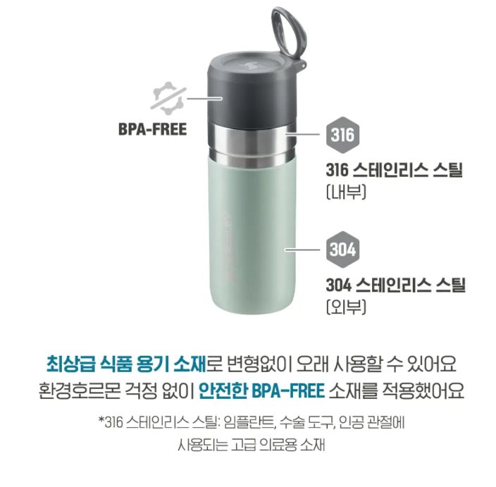 • 이중벽 진공 단열로 제작되어 보온과 보냉력이 우수하고, BPA-FREE로 유해물질 걱정 없이 안전하게 사용할 수 있습니다.