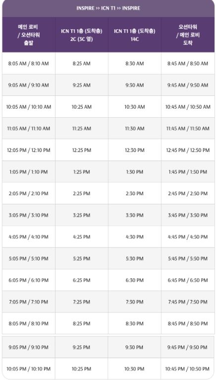 인천공항, 명동역, 대림역, 안산(정왕동) 코스로 운영하고 있으며, 출발지에 따라 셔틀 운영 시간이 다르기 때문에 방문 계획이 있으시면 사전 확인 후 이용하시길 추천해 드립니다.