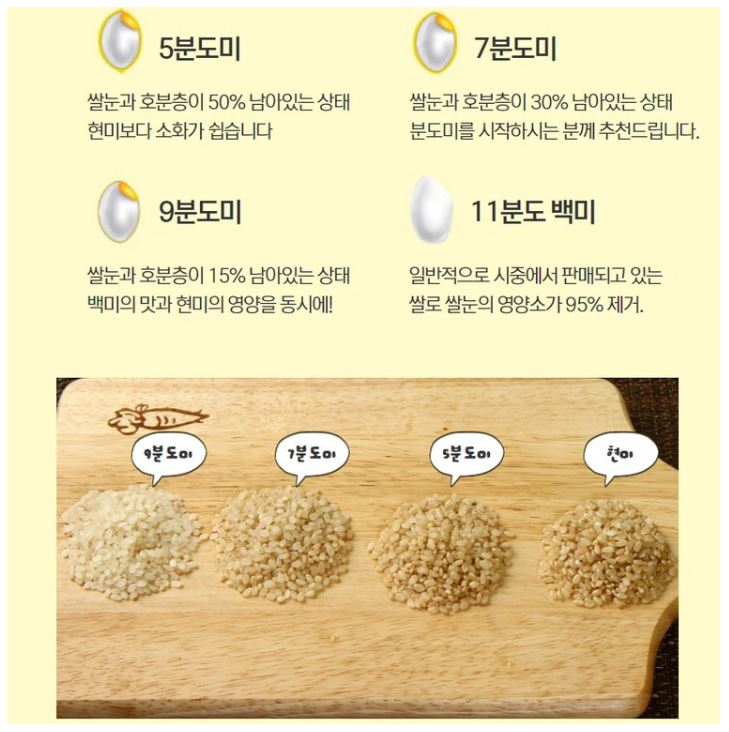쌀의 겉껍질을 벗기고 50% 정도만 도정하여, 백미보다 영양소가 풍부하고 현미보다 소화가 잘 되며, 비타민 B, 마그네슘, 철분, 미네랄 등 영양소가 많이 보존되어 있습니다.