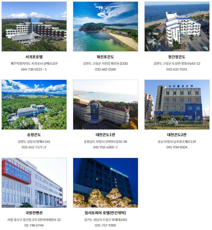 국군복지단의 호텔/콘도, 체력단련장 예약 서비스 및 복지시설 소개 등을 제공