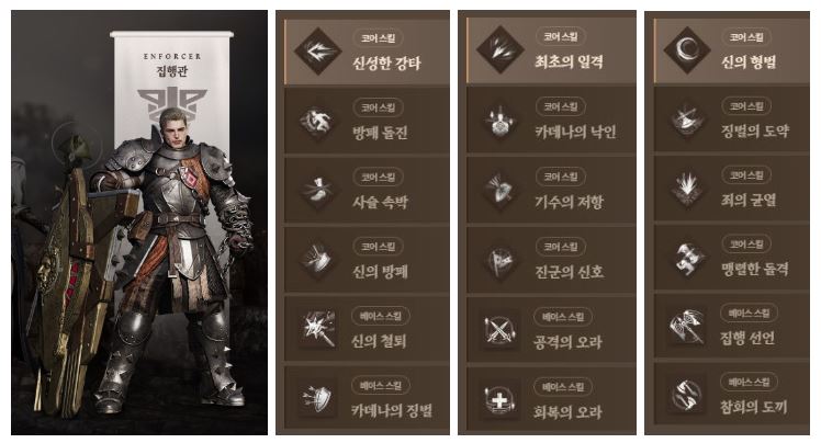 - 수호 / 신성한 강타, 방패 돌진, 사슬 속박, 신의 방패, 신의 철퇴, 카데나의 징벌