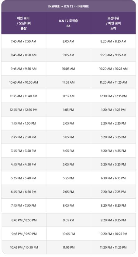 인천공항, 명동역, 대림역, 안산(정왕동) 코스로 운영하고 있으며, 출발지에 따라 셔틀 운영 시간이 다르기 때문에 방문 계획이 있으시면 사전 확인 후 이용하시길 추천해 드립니다.