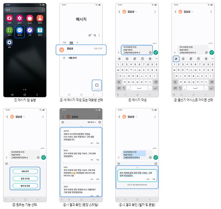 - 메시지앱 실행 > 새 메시지 작성(대화방) > 메시지 작성 > 글쓰기 어시스트 아이콘 선택 > 원하는 기능 선택 > 확인
