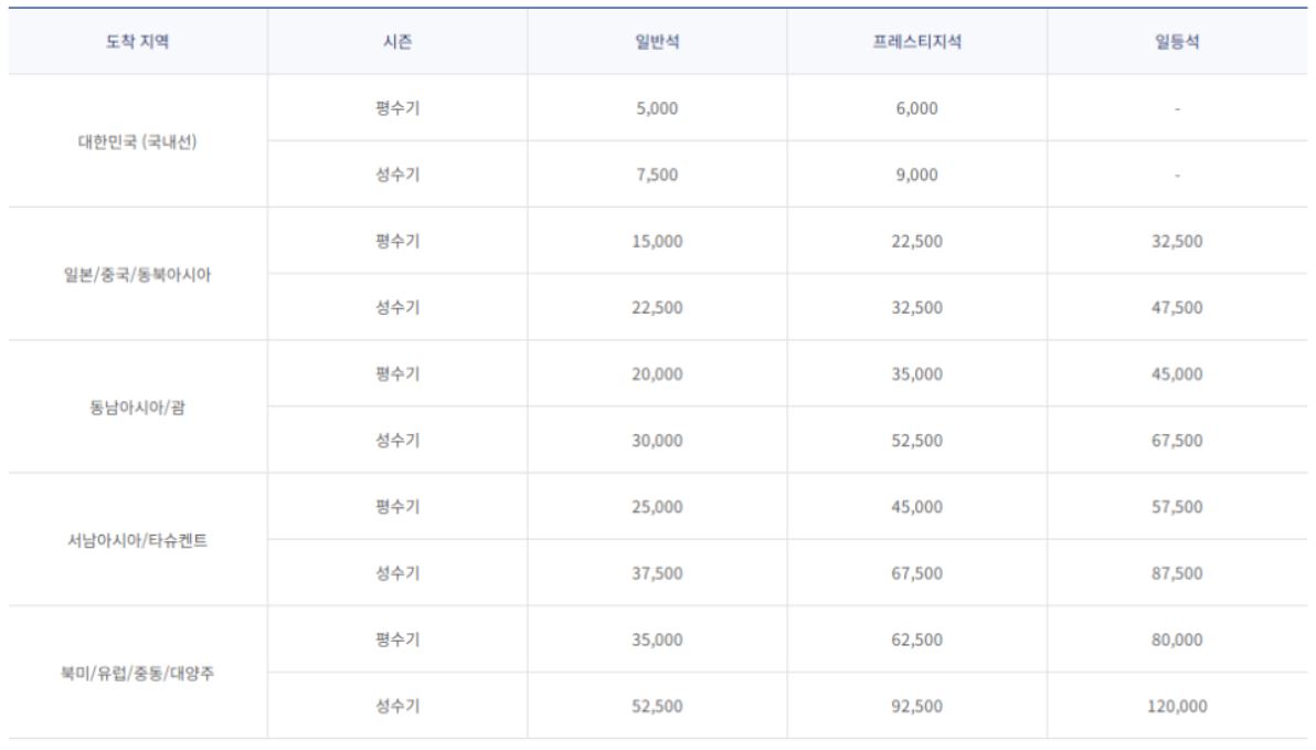 - 성수기 기간은 매년 항공권마다 바뀌니 대한항공 마일리지 몰 홈페이지를 확인하는 것이 좋습니다.