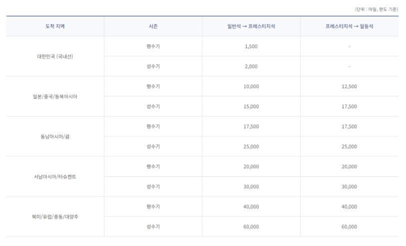 북미, 유럽, 대양주, 중동 평수기 35,000마일, 성수기는 52,500마일이며, 왕복 최소 70,000마일입니다.